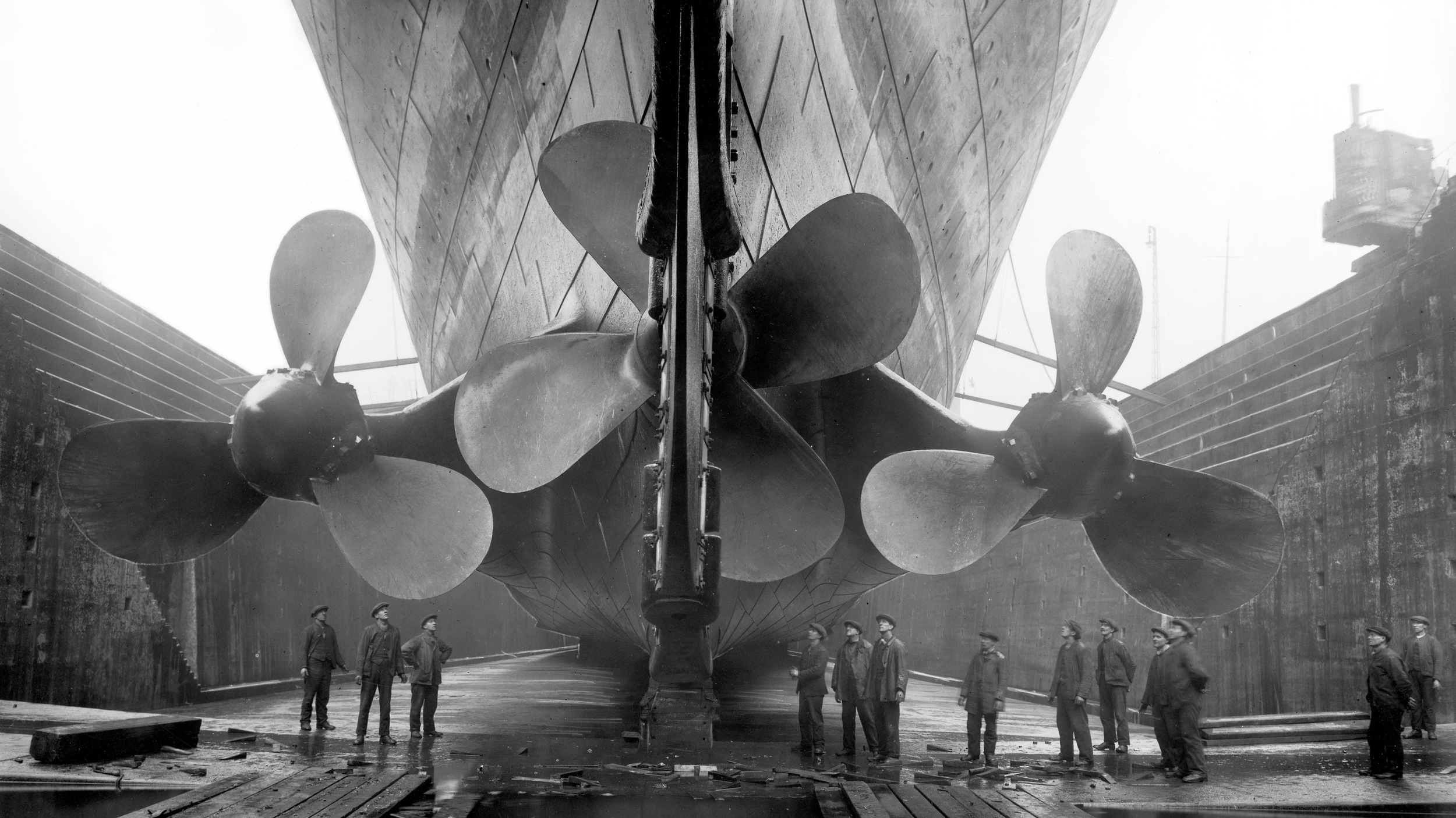 Titanic's triple screw propulsion system were crafted from brass. Note the center screw has four blades whilst the port and starboard have three..